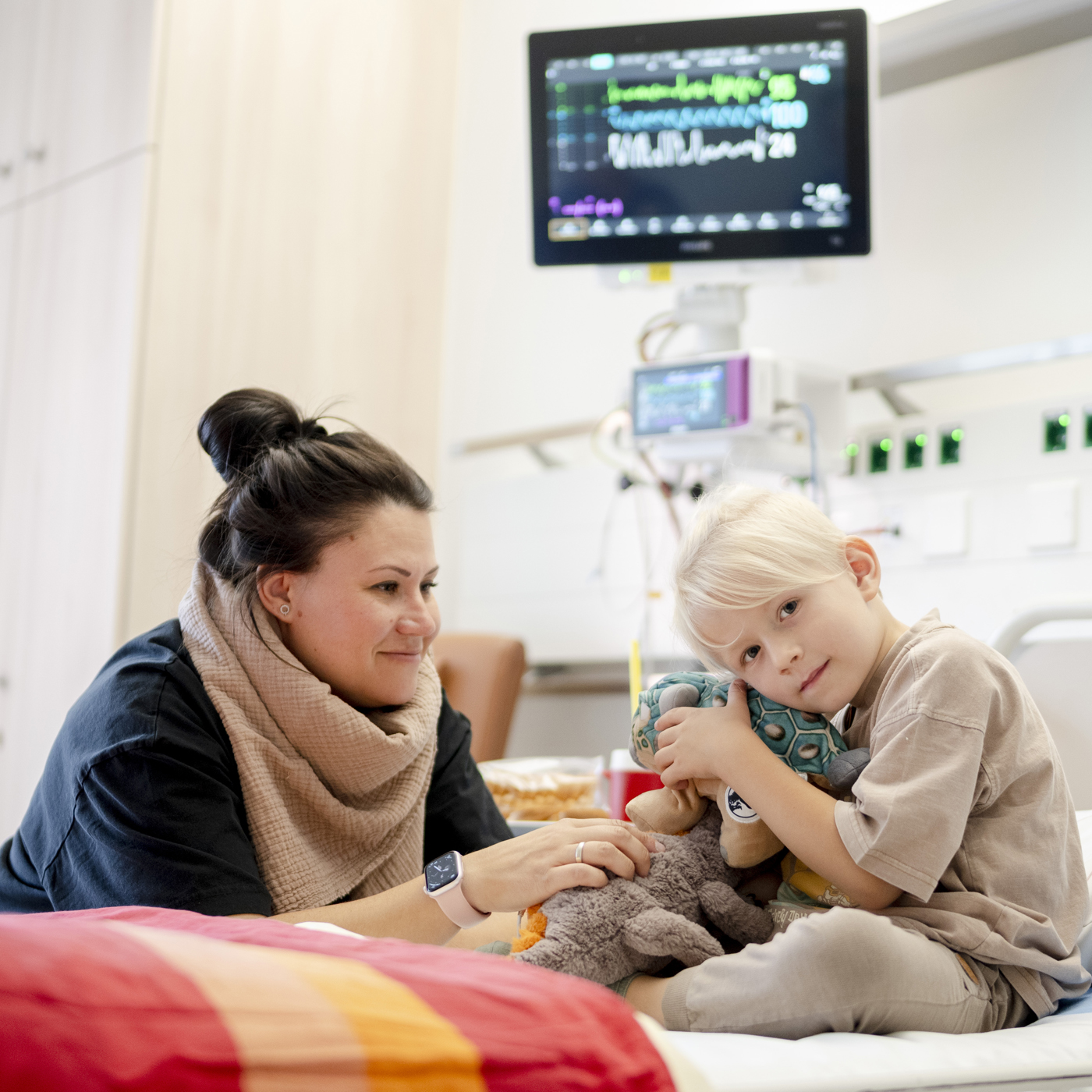 Der zweite Vorteil: auch im nicht-lebensbedrohlichen Krankheitsfall können die Neugeborenen behandelt/überwacht werden - oft sogar ohne Trennung von der Mutter. Dies gilt für „späte“ Frühgeborene, zu klein/ zu leicht geborene Neugeborene, Neugeborene mit Infektion, Neugeborenen-Gelbsucht, mütterlicher Einnahme bestimmter Medikamente, insulinpflichtigem mütterlichem Diabetes, Kinder mit bestimmten Fehlbildungen und weiteren pädiatrischen Krankheitsbildern. Eltern werden auch auf der Intensivstation so früh und so intensiv wie möglich in die Pflege des Kindes eingebunden.
